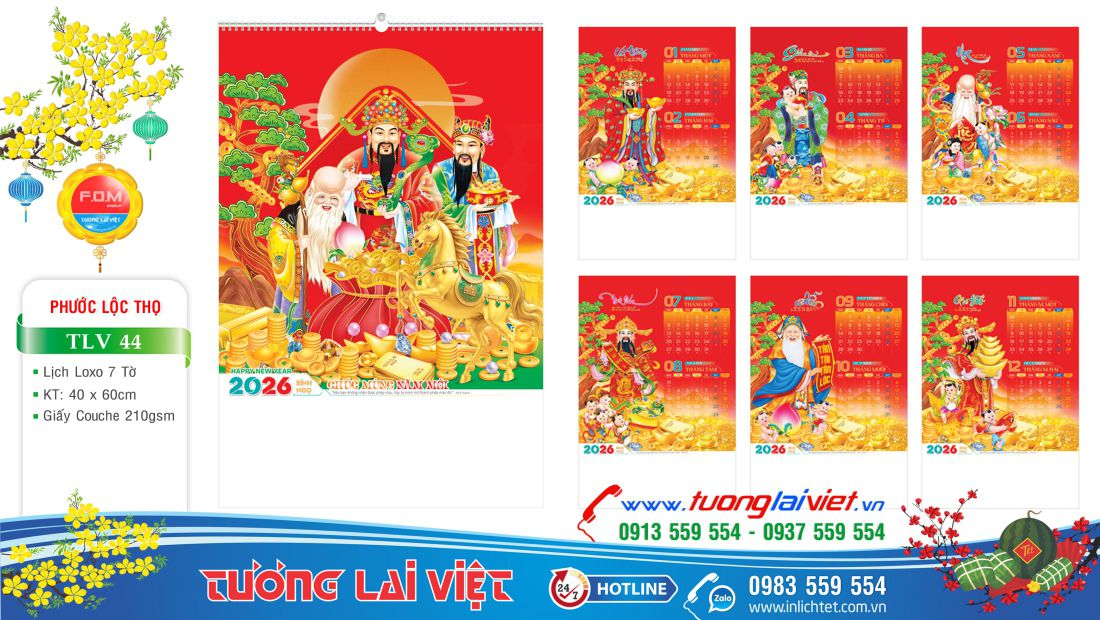 Mẫu Lịch treo tường 7 tờ Phúc Lộc Thọ là lịch lò xo 7 tờ có các kích thước 40×60 và 36×70; in Offset 7 tờ 1 mặt trên giấy C210gsm. Ngoài Lịch lò xo 7 tờ, còn có Lịch nẹp thiếc 5 tờ – 7 tờ và Lịch 13 Tờ bộ số. In Lịch treo tường 7 tờ với chi phí rẻ vừa phải phù hợp với những cửa hàng nhỏ lẻ như: Tiệm tạp hoá, Cửa hàng gas, Cửa hàng gạo, Cửa hàng bánh kẹo, Cửa hàng xăng dầu, Cửa hàng vật liệu xây dựng, Quán cafe, …